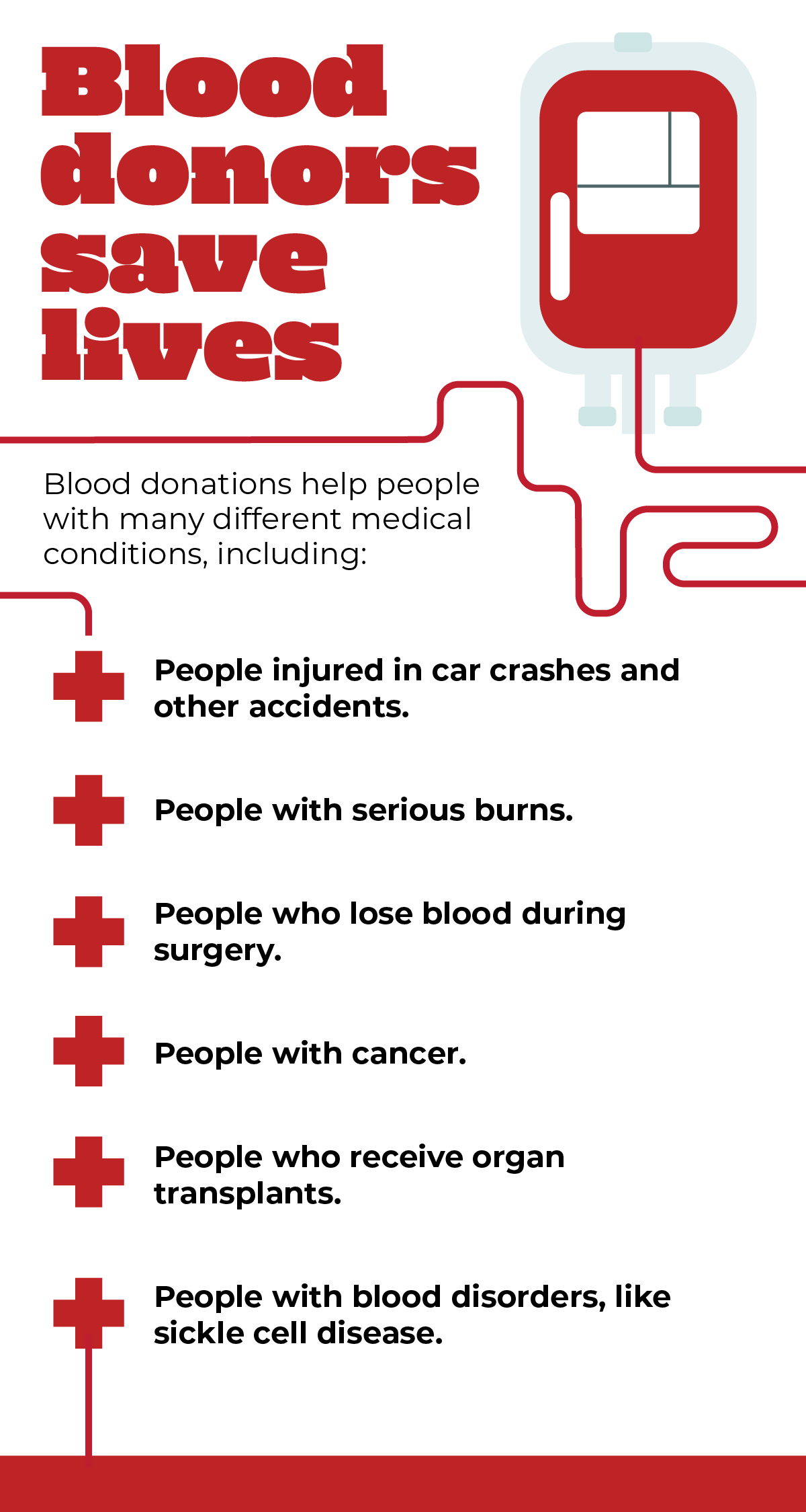 When you donate blood, it does a lot of good. It can even save lives. Here are just some of the people who depend on blood donors like you.